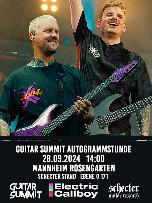 Guitar Summit Artist-Alarm! Daniel Haniß und Pascal Schillo von Electric Callboy werden am Samstag, den 28.09.2024 um 14:00 Uhr eine Autogrammstunde an unserem Schecter Stand (Ebene 0, Stand 171) machen. Das solltet ihr euch nicht entgehen lassen!